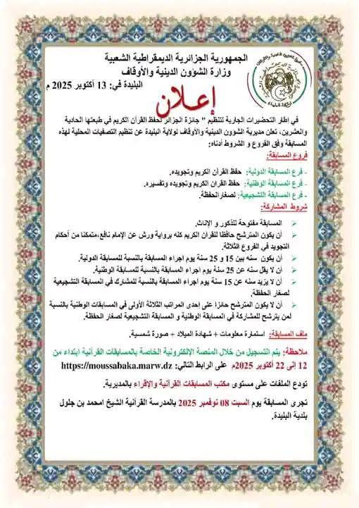 مسابقة حفظ القرآن الكريم بالبليدة وزارة الشؤون الدينية أكتوبر 2025م